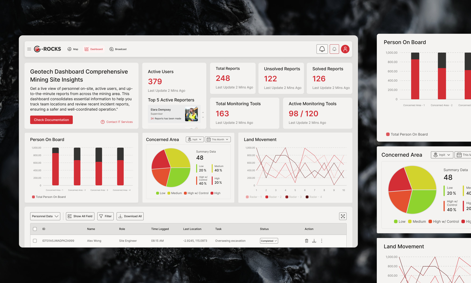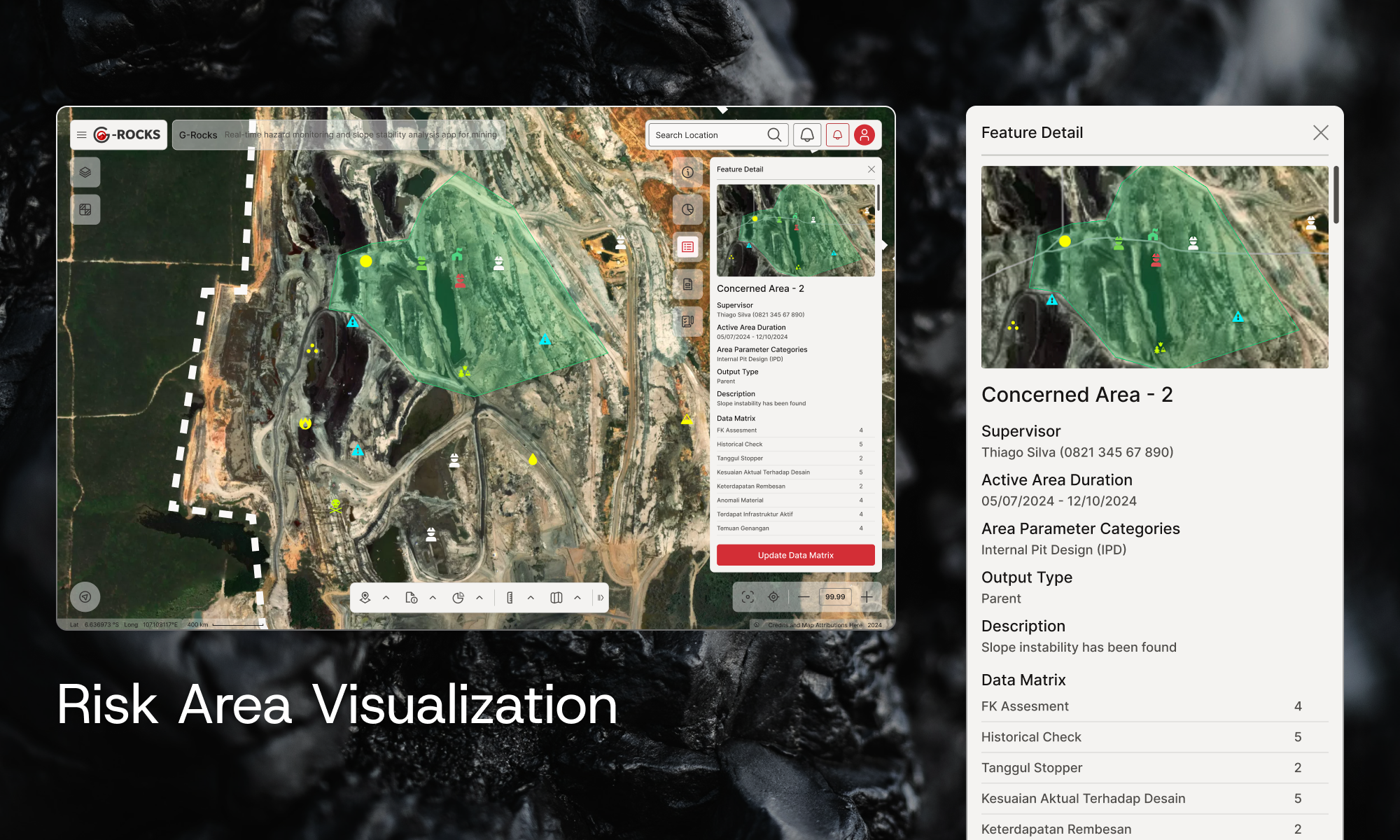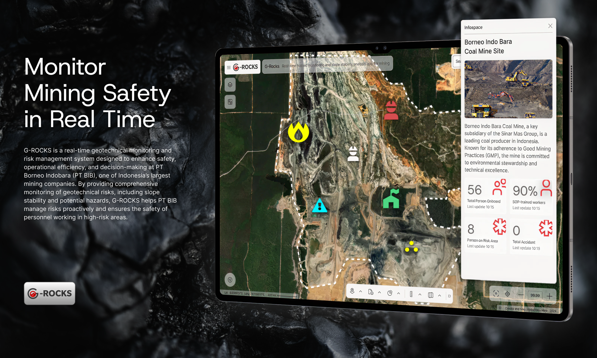 G-ROCKS is a real-time geotechnical monitoring and risk management system designed to enhance safety, operational efficiency, and decision-making at PT Borneo Indobara (PT BIB), one of Indonesia’s largest mining companies. By providing comprehensive monitoring of geotechnical risks, including slope stability and potential hazards, G-ROCKS helps PT BIB manage risks proactively and ensures the safety of personnel working in high-risk areas.