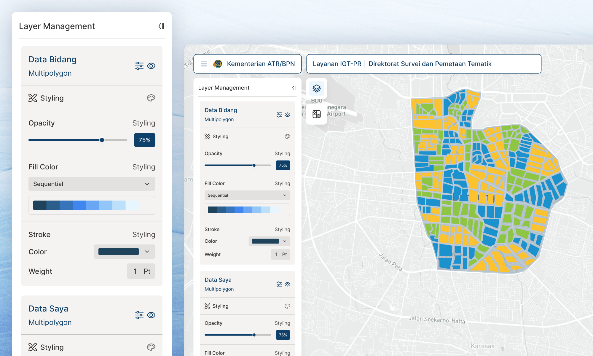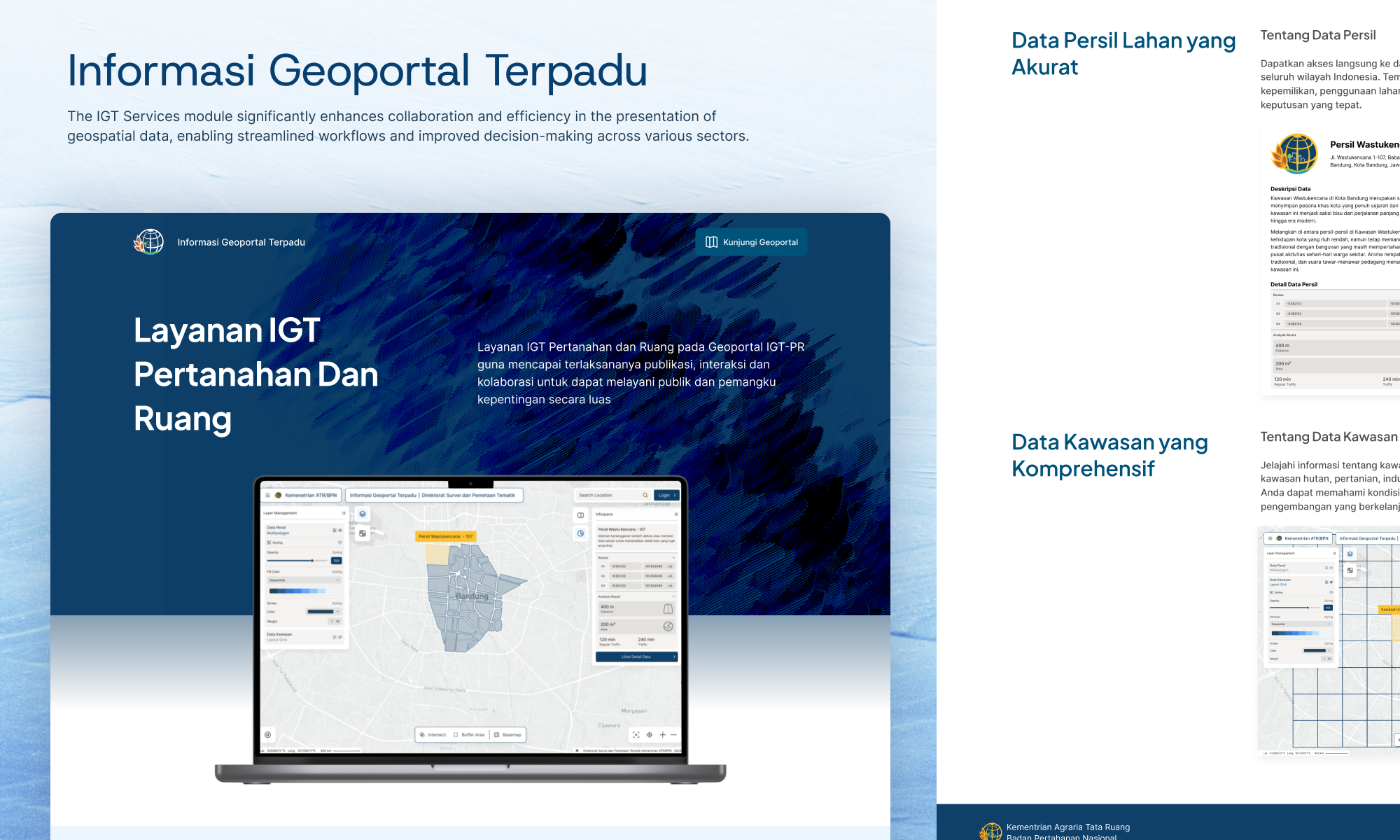 The IGT Services module significantly enhances collaboration and efficiency in the presentation of geospatial data, enabling streamlined workflows and improved decision-making across various sectors. By leveraging AI technology, the module ensures the standardization of geospatial data and promotes continuous innovation in the development of geospatial information systems. The IGT platform is instrumental in the One Map Policy for Better Governance, and has played a pivotal role in the Geoportal IGT Pertanahan dan Ruang by the Ministry of ATR/BPN. This initiative has been recognized for its contribution to transparent, effective governance and land management in Indonesia.